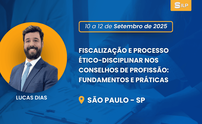 Fiscalização e Processo Ético-Disciplinar nos Conselhos de Profissão: Fundamentos e Práticas, nos dias 10 a 12 de Setembro de 2025. Presencial em São Paulo – SP, com carga horária de 18 horas.